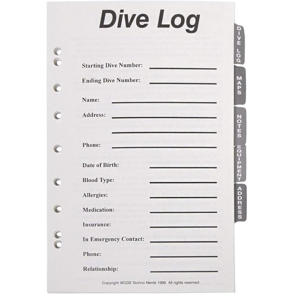 Complete dive log refill sheet pack for dive log organizers Index page logs 40 dives, 10 site maps, 6 note sheets, 6 address sheets.