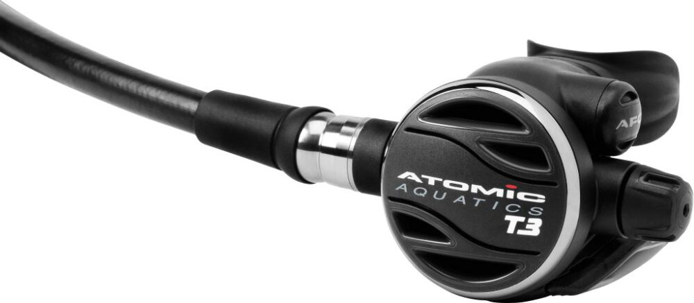The T3 second-stage regulator is equipped with Atomics patented automatic flow control (AFC). This unique diaphragm activated vain automatically controls the flow and venturi-effect of the second-stage for optimum breathing resistance at all depths. The second-stage does have a soft over molded rapid adjustment knob for rare special situations. If you have ever experience the pulling effect" of the regulator second-stage when you turn your head underwater, those days are gone with Atomics all titanium comfort swivel with a black PVD coating. Perhaps one of the most admired features of Atomic second stages is the patented comfort swivel which allows 30° rotational movement without binding or kinking.