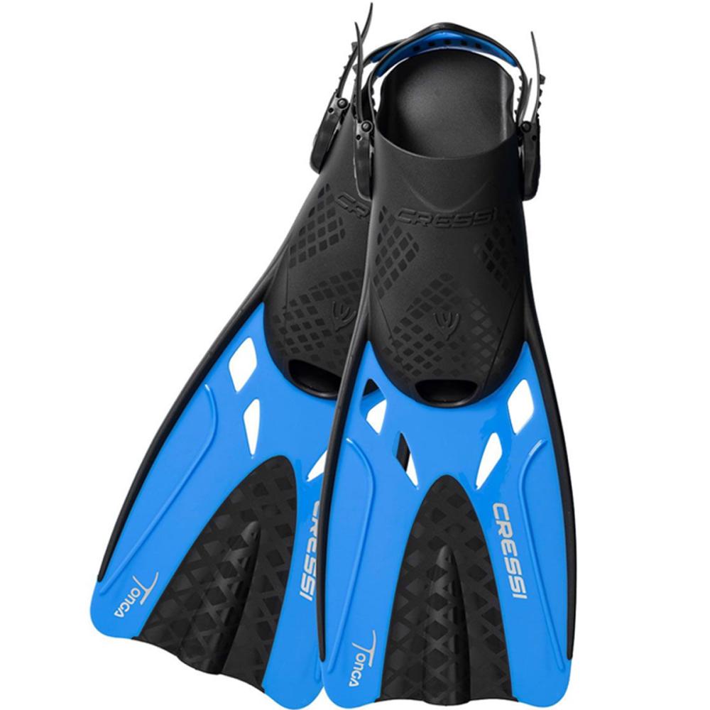 The Cressi Tonga are short open heel fins with adjustable straps to use both outdoors and indoors. They are ideal for travelers thanks to their dimensions and lightweight. The buckles have a special design to ensure robustness and long use. The fin strap features a large thumb loop to make donning and doffing easy. Thumb loop is also practical to hang fins on a hook. The foot pocket is made of a rubber material that is comfortable and easily adapts to different shapes of feet. Being an open heel foot pocket fin with an adjustable strap, it adapts to different size feet and can be shared by different people who have a similar foot size. The composite design of the blade provides comfortable finning and helps to reduce leg cramping. The fins come with a practical net bag ideal for rinsing the fins after use and removing any sand. Fins are available in multiple color choices.