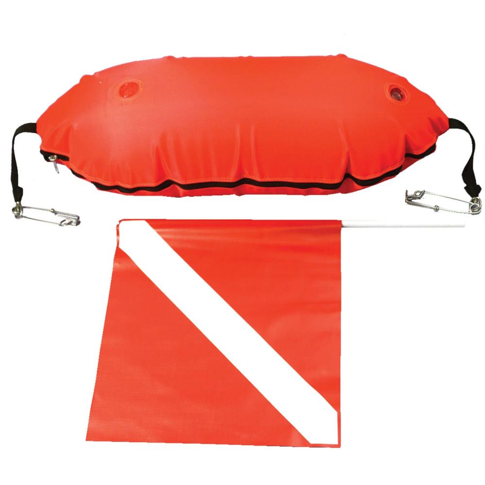The deflated buoy can be rolled up and easily carried or stowed. Traditional diver down flag attaches to the top of the buoy to further increase visibility and alert others on the surface to the presence of one or more divers below.