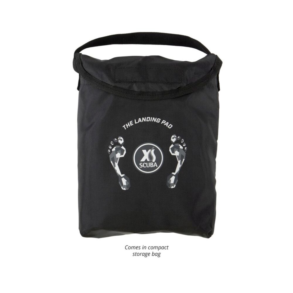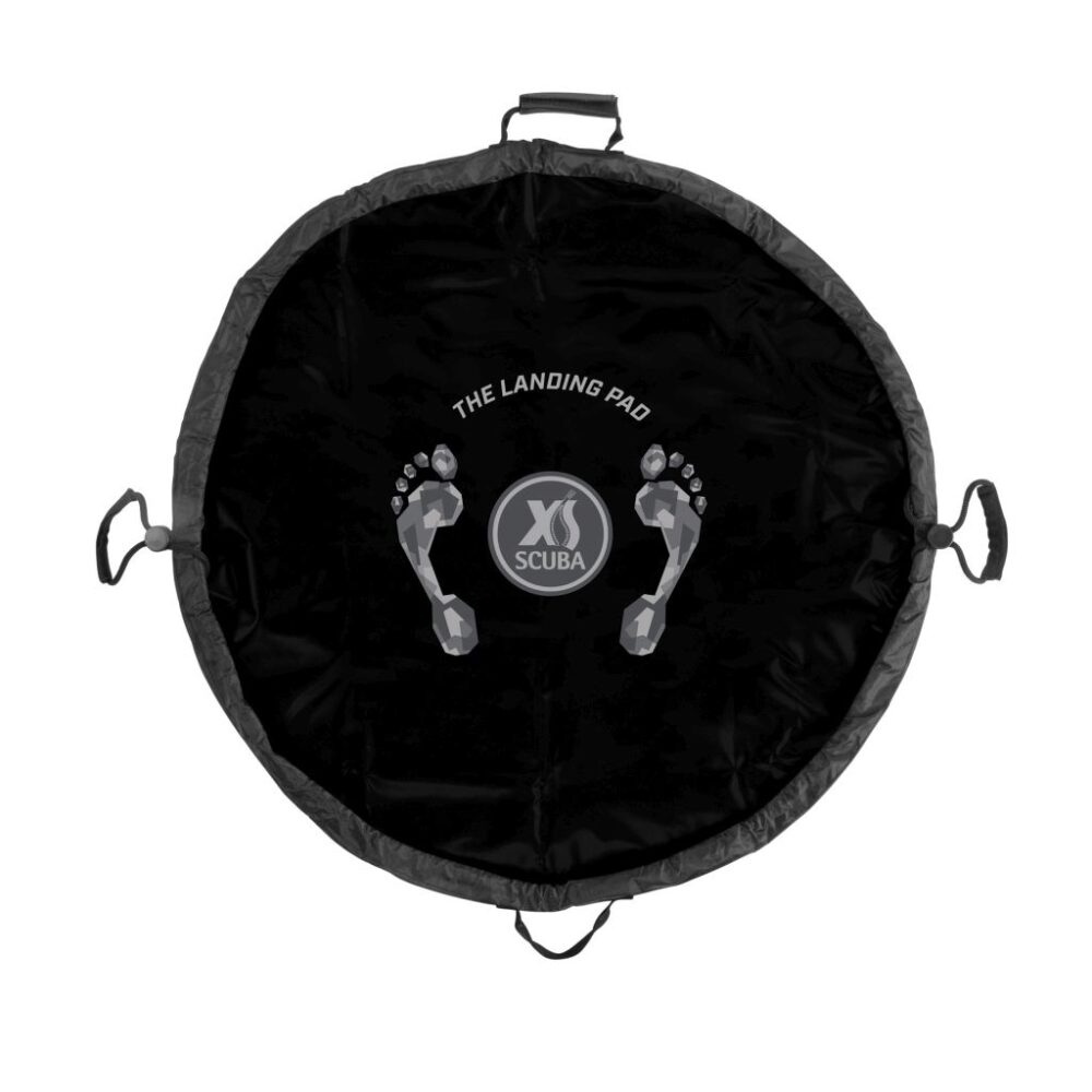 The Landing Pad: Beach divers, XS Scuba heard your cry! You don't want to put wet, sandy wetsuits and boots in the trunk of your car or in your gear bag with your other gear. The Landing Pad is meant for you. Spread the large 36" (91.5cm) diameter Landing Pad flat on the ground. Stand on it while peeling off your wet, sandy boots and wetsuit. Pull up on the two handles to cinch the pad around your legs. Step out of it, fasten it, and throw it in the trunk. The water, sand and mud stay contained in the Landing Pad. The bottom is made from rugged, thick tarpaulin. Nylon ropes pull through stainless steel grommets, and the Landing Pad has hook and loop fastener wrap-around handle closure at the top for easy transport. Compact storage bag included with top grab handle.