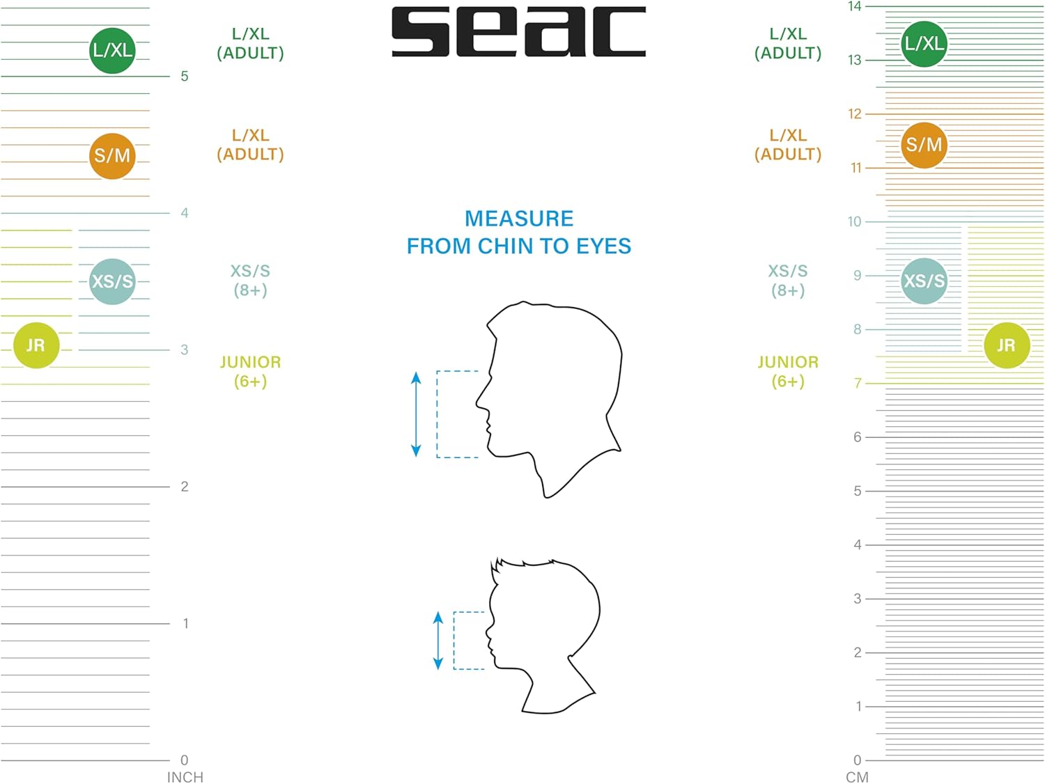 The Seac Libera snorkel is designed with a dry top system that safeguards against accidental water entry during submersion, while its brightly colored exterior provides clear visibility on the water's surface. The mask is available in three sizes, XS-S (<10 cm), S-M (10-11.5 cm), and L-XL (>11.5 cm), based on the distance from the nose to the chin. For those with smaller facial structures, the XS-S size is a perfect fit with a reduced skirt and a lighter, smaller body.