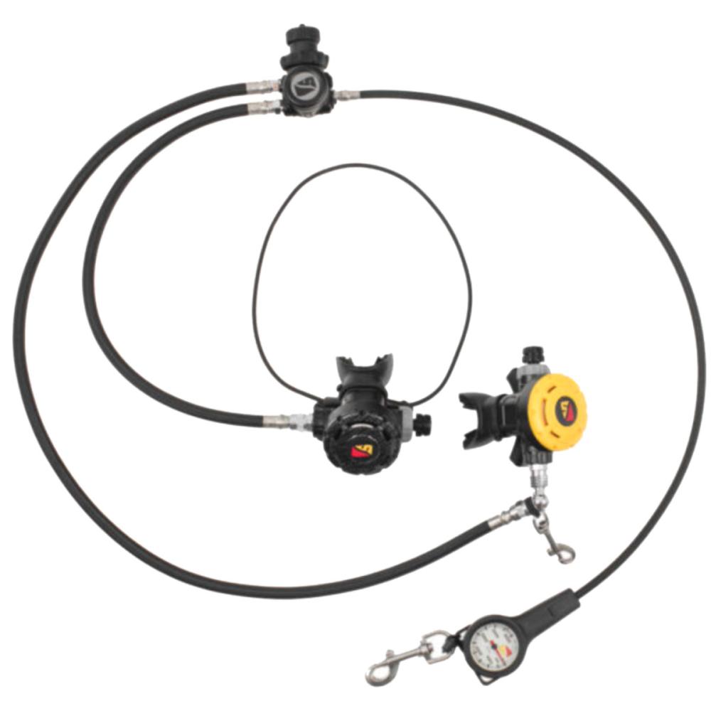 The FT1 First Stage's fixed turret design enables streamlined hose routing, with the primary second stage routed under the diver's arm. The backup second stage is on a 22" flex hose with a necklace for quick access. A Mini Tech 2" Brass SPG on a 30" flex hose allows easy viewing, while a carrying bag ensures convenient transportation. Available in Yoke or DIN.