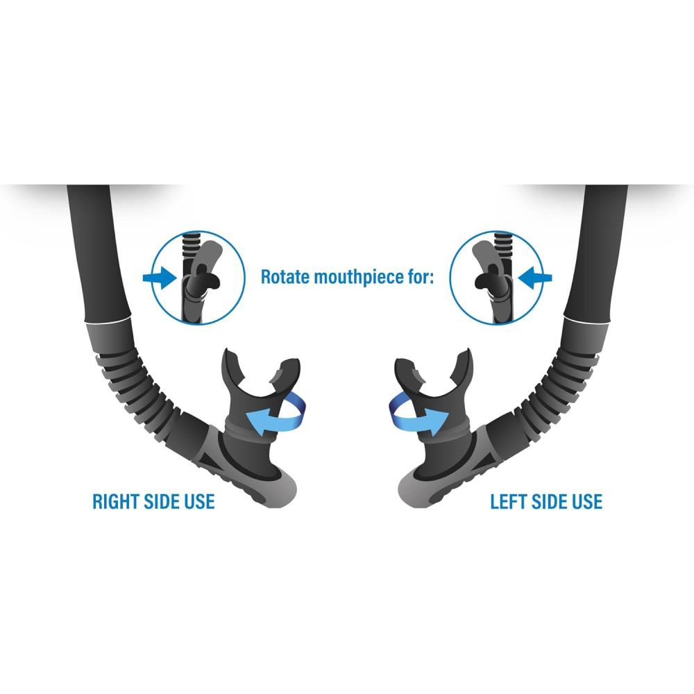 - Silicone snorkel that can be oriented either to the right or left side, depending on personal taste and teaching methods followed