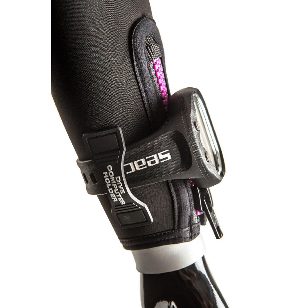 And there's more! Geometrically patterned, the suit's protective inserts on the chest and shoulders safeguard against friction from diving gear. Plus, a savvy rubber buttonhole insert on the left cuff keeps your dive computer securely in place. Seac Space is available in 5 or 7 mm neoprene.